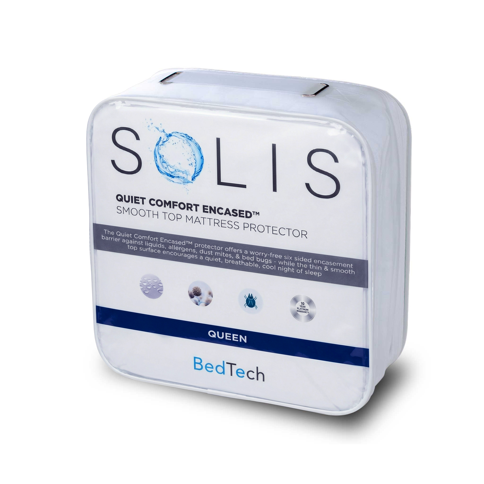 The Quiet Comfort Encased™ protector offers a worry-free six sided encasement barrier against liquids, allergens, dust mites, and bed bugs - while the thin and smooth top surface encourages a quiet, breathable, cool night of sleep.